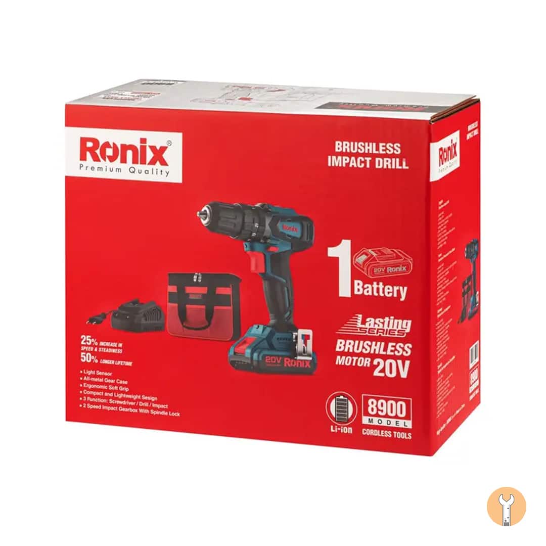 · دریل شارژی 8900 در جعبه رنگی طراحی شده توسط رونیکس عرضه میشود.