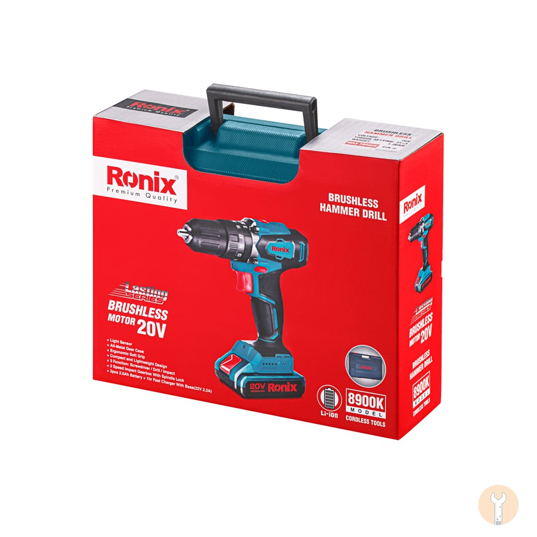 دریل شارژی K8900 در کیف BMC مقاوم در برابر ضربه عرضه و یک جفت باتری 20 ولت با ظرفیت 2 آمپرساعت به علاوه یک فست شارژر باکیفیت همراه این محصول ارائه می شود.