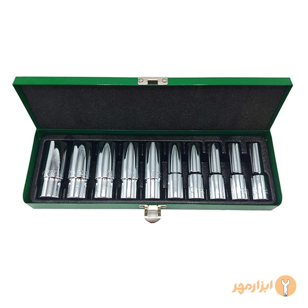 درهمین راستا این شرکت یکی از محصولات پر کاربرد خود یعنی بکس از نوع بلند و با درایو معروف 1/2 اینچ را در یک مجموعه 10 عددی و در داخل یک جعبه فلزی با کیفیت به ابعاد 313*111*88 سانتیمترجمع کرده است.